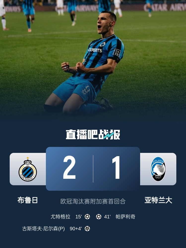 歐冠淘汰賽附加賽首回合,布魯日2-1絕殺亞特蘭大,絕殺點球引爭議。