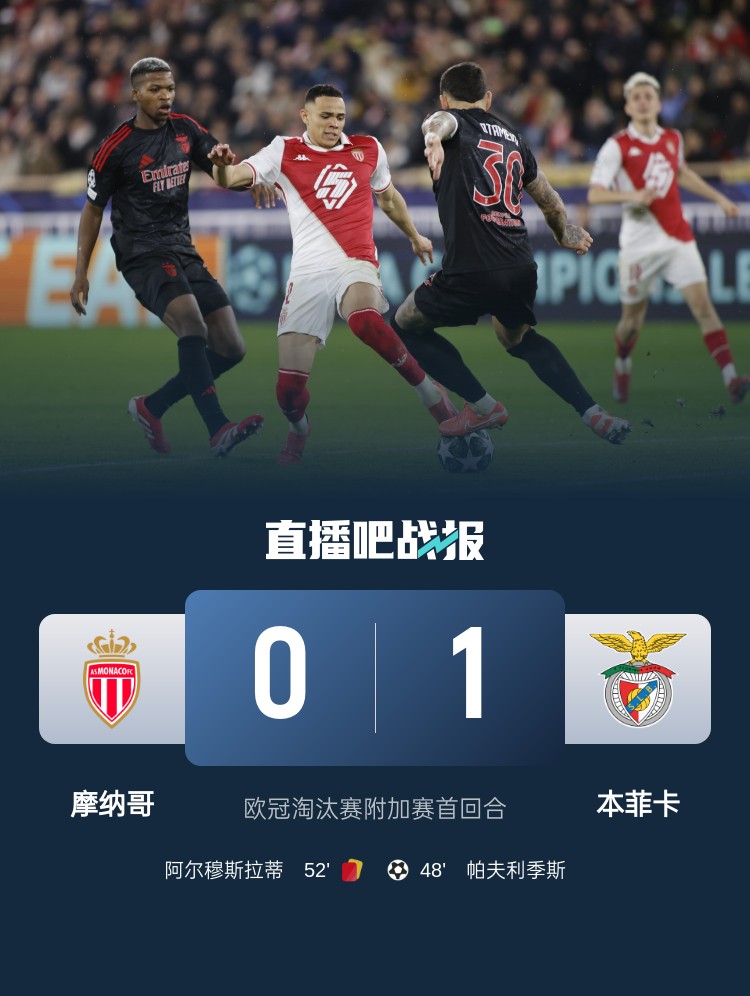 歐冠淘汰賽附加賽首回合,本菲卡客場1-0摩納哥,帕夫利季斯制勝。